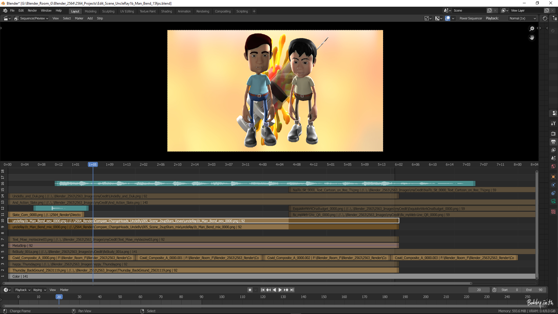 ข้อมูลเบื้องต้นคือ ๑. ผมเคลื่อนไหวตัวการ์ตูนบน Timeline ในระบบ SMPTE [Society of Motion Picture and Television Engineers] (00:00:00:00) ดังนั้นเมื่อเปลี่ยน fps ไปที่ค่าใดก็ตาม เวลาการเคลื่อนไหว ของตัวการ์ตูนบน Timeline จะยังคงที่เสมอ เช่น 00:00:01:00 (หนึ่งวินาที กับ 0 เฟรม) จะมีแต่จำนวนเฟรมเท่านั้น ที่เปลี่ยนไปตามค่า fps ๒. โดยปกติผม(คุ้นชิน) ทำแอ็คชั่นที่ 30/fps ๓. เมื่อ preview render (Shaded & Wireframe) เป็นที่พอใจแล้ว ผมจะเปลี่ยนค่า fps มาเป็นที่ 24/fps แล้ว export เฟรมทั้งหมด ส่งไปโปรแกรม Blender เพื่อจัดแสง, ทำ final render ๔. ขั้นตอน post production ทำที่ 24/fps ทั้งหมด ๕. และคลิ้ปวิดีโอที่นำเสนอบนหน้าเว็บก็จะใช้ค่า 24/fps (มีเปลี่ยน fps บ้างเพื่อทดลอง) เหตุปัจจัยที่ทำให้คิดถึงการลดจำนวนเฟรมของคนทำ cel animation เพราะ ที่ 24/fps จำนวนเฟรมมากเกิน, จบงานคลิ้ปไม่ได้ใน ๑ วัน ตามเป้าหมาย แต่พอ เปลี่ยนค่าเป็น 15/fps สามารถทำงานเสร็จได้อย่างสบายๆ ๖. คลิ้ปข้างล่างทุกค่า @/fps มาจากเฟรมภาพนิ่งต่อเนื่อง (.png) ชุดเดียวกันทั้งหมด, ตัดต่อ (edit) แล้วสั่ง render เป็น AVI Raw (15/fps) จากนั้นนำไปเปลี่ยนค่า fps ใน VietualDub ให้เป็น 24/fps, 25/fps, 30/fps แล้วจึงส่งกลับมาทำเป็น .mp4 ใน Blender อีกครั้ง คือคลิ้ปที่อยู่ข้างล่างทั้ง 4 คลิ้ป (@15/fps คือคลิ้ปต้นฉบับจากภาพนิ่งต่อเนื่อง(.png) ที่ render ออกมา) |